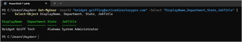 Get-MgUser -UserId "[email protected]" -Select "DisplayName,Department,State,JobTitle" |