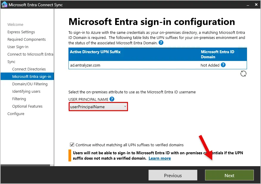 Select “Continue without matching all UPN suffixes to verified domains” and click “Next”.