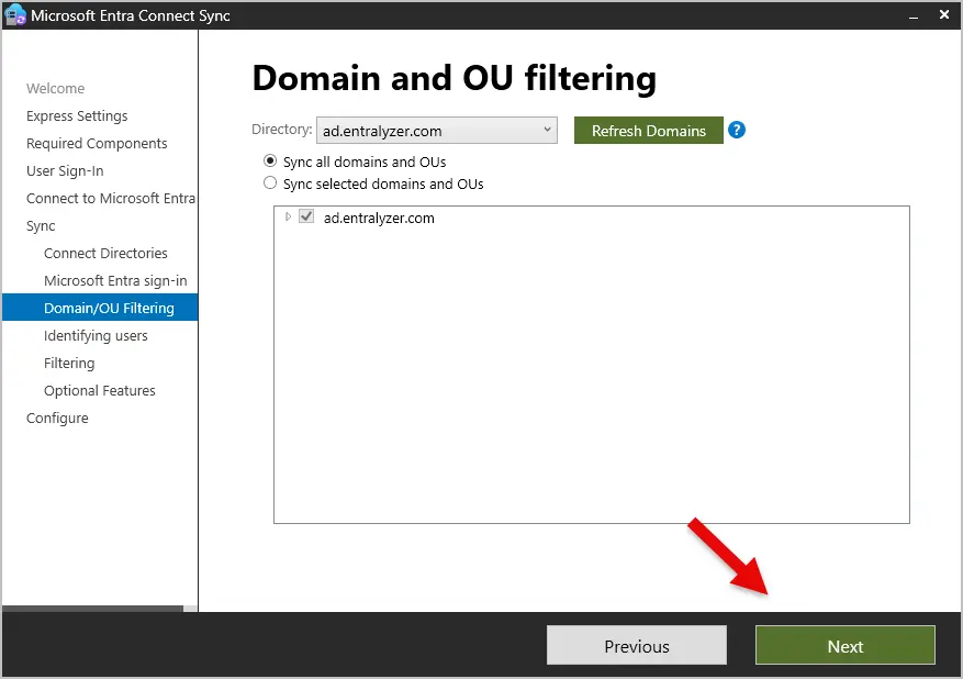 Step 10: On the Domain and OU Filtering screen, you can choose to sync all domains and OUs or select specific ones. In this example, I’ll select all domains and OUs, but you can limit the sync to only certain domains or OUs if needed.