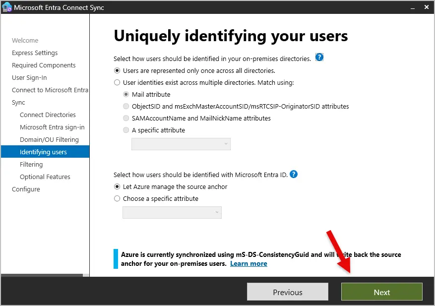 Step 11: On the “Identifying Users” screen, choose how users will be identified in your on-premises directory and how they’ll match up with Microsoft Entra ID. The default settings work just fine, so I’m leaving those as they are.