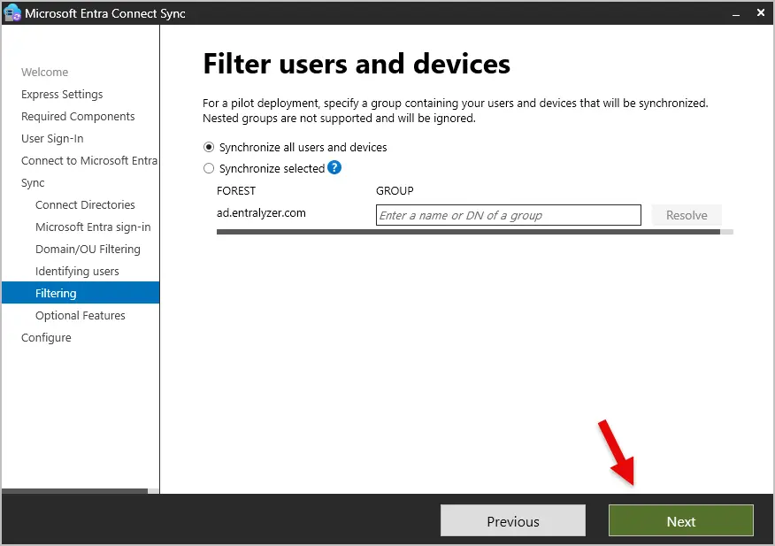 Step 12: On the “Filtering” screen, pick how you want to sync users and devices. I recommend the default option “Synchronize all users and devices” unless you’re just testing or running a pilot.