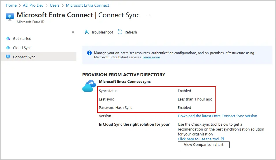 You can view the sync status by logging into the Microsoft Entra admin center, click on “Entra Connect” in the side bar menu and then click on “Connect Sync”.