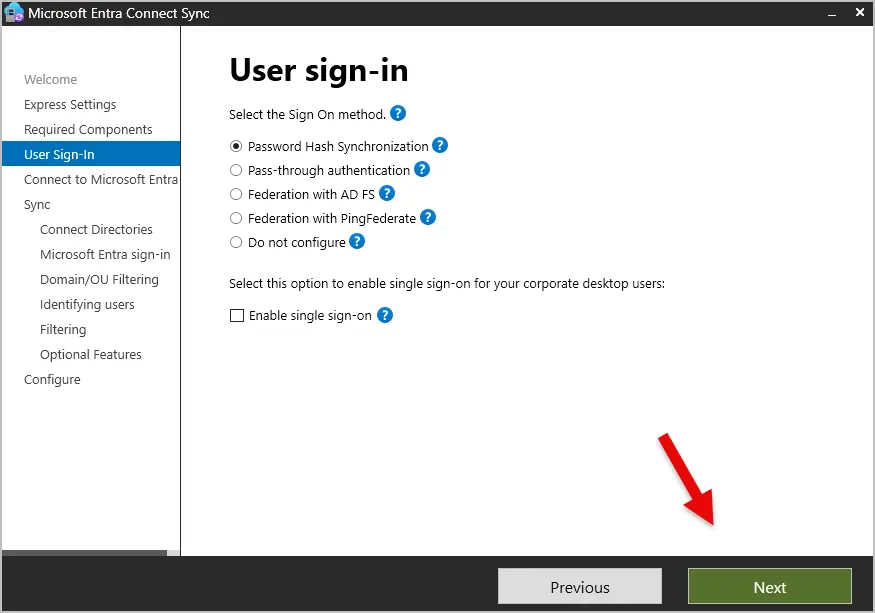Step 5: On the User sign-in screen, select your sign on method and click “Next”. In most cases Password Hash Synchronization is used.