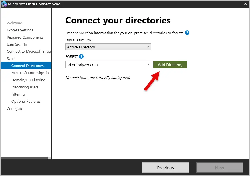 Step 7: On the Connect your directories screen, under FOREST, select your directory and click “Add Directory”.