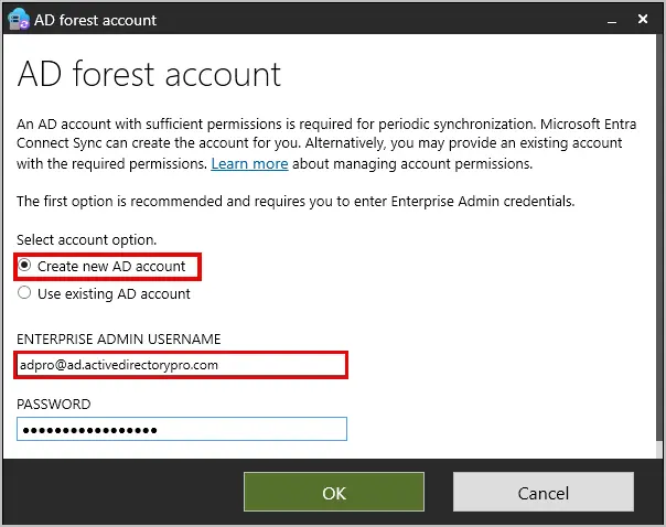 Step 8: Select “Create new AD account” and fill in the box with your Active Directory account that has enterprise admin permissions. Then click “OK”.