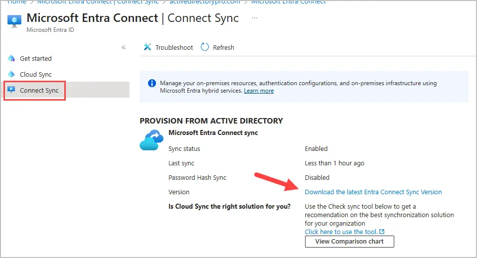 Step 3: Click on “Connect Sync” and “Download the latest Entra Connect Sync Version”. This will download the AzureADConnect.msi install file.
